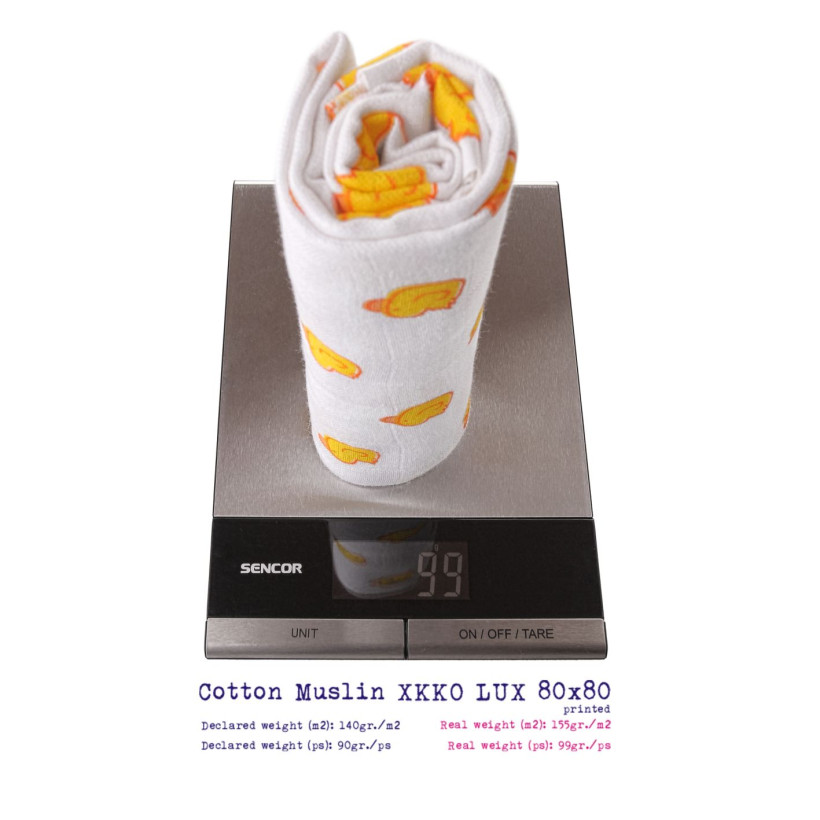 Klassische Musselinwindel aus Baumwolle, hergestellt aus Fasern mit der Stärke von 21s. Das Gewicht und die Dichtheit der Windel XKKO LUX ist wesentlich höher als das bei einer üblichen Baumwollwindel der Fall ist.