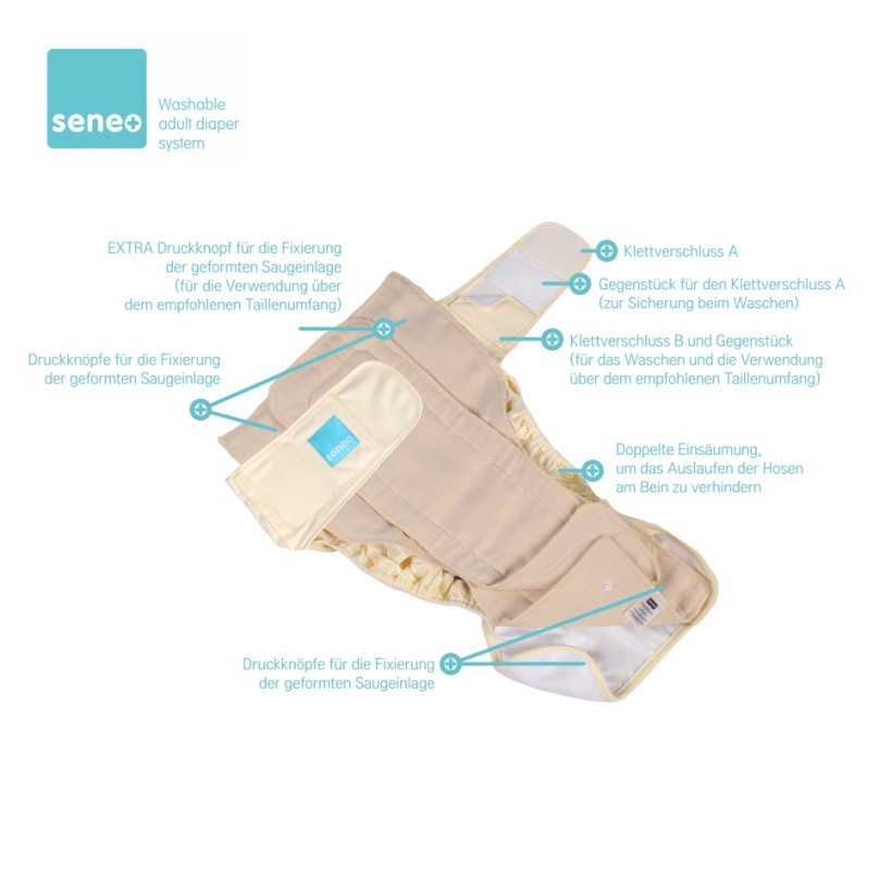 Wenn Sie die Lebensdauer des saugenden Teils des Windelsystems SENEO verlängern und Kosten beim Waschen sparen möchten, empfehlen wir als zusätzliche, trennende Schicht Separationswindeln aus Zellulose oder Bambus oder die biologisch abbaubaren PLA XKKO ECO Separationswindeln, die aus Maisstärkeresten hergestellt werden, einzulegen.